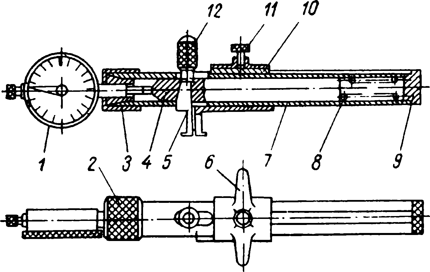 The bore gauge consists of an indicator 1 secured in a housing 7 by means of a collet 3 and a nut 2. The indicator rod contacts a plunger 4, in which a measuring tab 5 is secured by means of a wedge. The tab is tightened by means of a handle 12, which is screwed onto the threaded part of the tab 5. The second jaw is made integral with the clamp 6. The clamp can move along the axis of the housing 7 and is prevented from turning around the housing by a key 10. The clamp is locked in the desired position by a screw 11. The movement of the clamp together with the button is ensured by the presence of a groove in the housing. Plunger 4 is spring-loaded by spring 8, which is located in the housing between the plunger end and plug 9. The jaws are designed as two overlapping plates (as is the case with lightweight calipers with a measurement accuracy of 0.1 mm, manufactured by the Kalibr plant). The bore gauge is set to the required size using a standard 16 micrometer bracket or a block of end gauges clamped in a clamp. When adjusting, it is necessary to apply some tension to the indicator (0.1-0.5 mm).