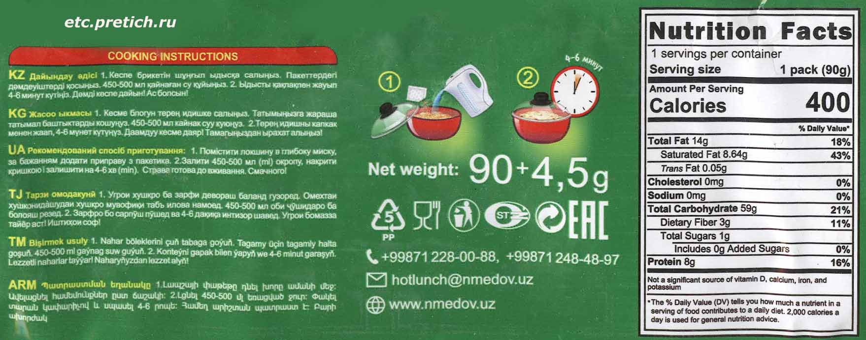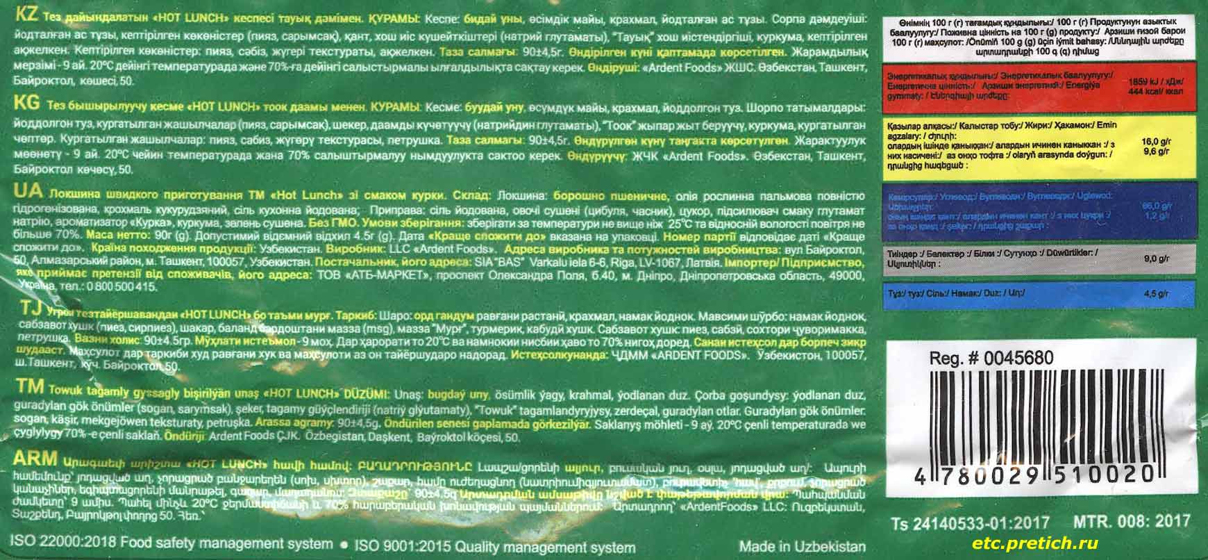 На обратной стороне информации больше, но вся она на казахском и киргизском, украинском и таджикском, на туркменском и армянском. Почему нет на русском языке, почему такая дискриминация? Не известно. Итак, это: лапша быстрого приготовления "Hot Lunch" со вкусом курицы. Состав лапши: мука пшеничная, масло растительное пальмовое полностью гидрогенизированное, крахмал кукурузный, соль поваренная йодированная. Приправа: соль йодированная, сушеные овощи (лук, чеснок), сахар, усилитель вкуса глутамат натрия, ароматизатор «Курица», куркума, зелень сушеная. Без ГМО. Условия хранения: хранить при температуре не выше 25°С и относительной влажности воздуха не более 70%. Вес нетто 90 + 4,5 грамма. Срок годности 1 год. Производитель: LLC "Ardent Foods", Узбекистан, Ташкент.