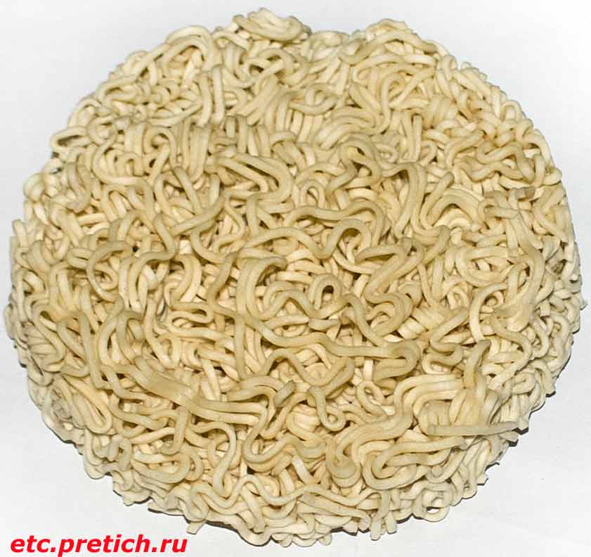 Итак, вскрываем упаковку и достаем - брикет сухой лапши, это круглая такая "шайба". Дело в том, что эту же лапшу используют и в круглых стаканчиках...