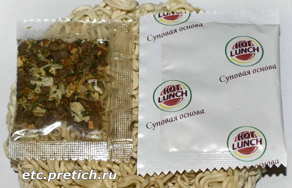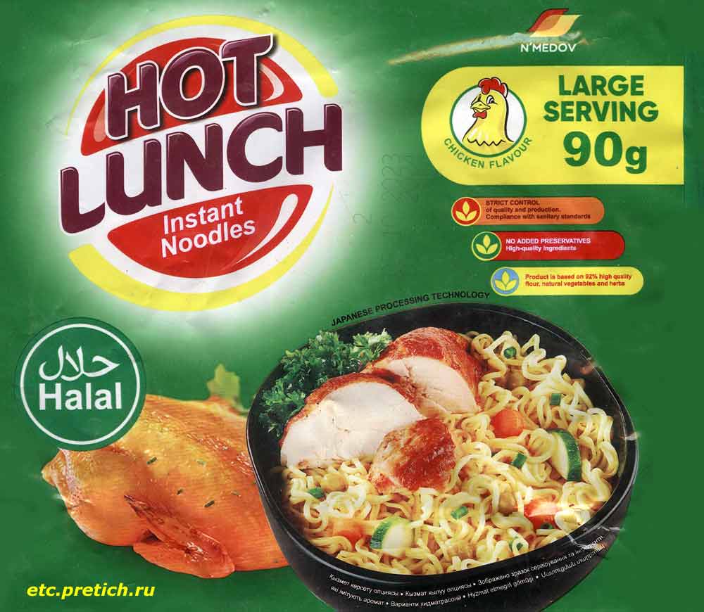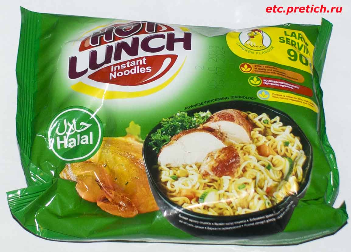На лицевой стороне, да и вообще на всем пакете ни слова по-русски нет! Потому переводу как смогу. Итого торговая марка Hot Lunch, лапша быстрого приготовления. Но, в общем-то, все и так понятно: нарисована курочка, значит куриный вкус.