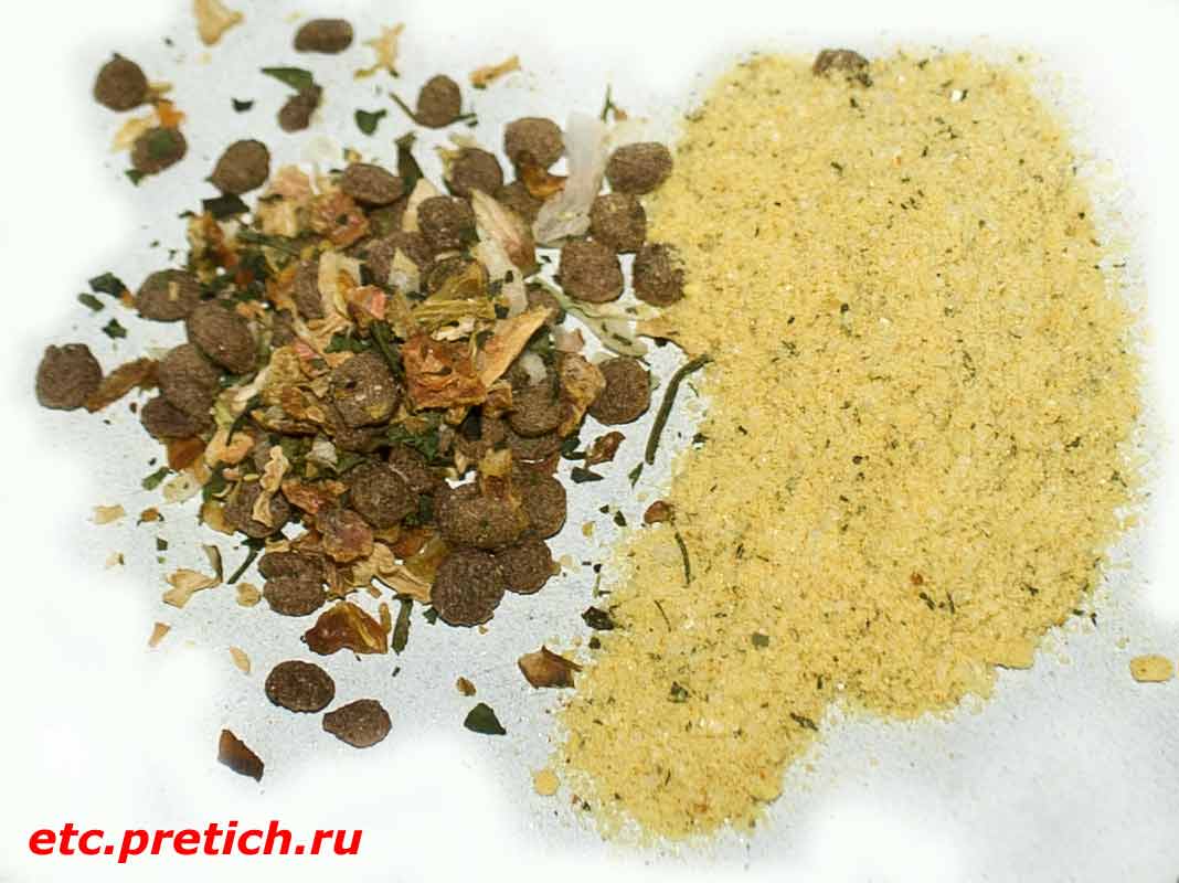 Высыпаем их содержимое в миску и смотрим - ну понятно... овощи и порошок, все это имеет определенный запах.