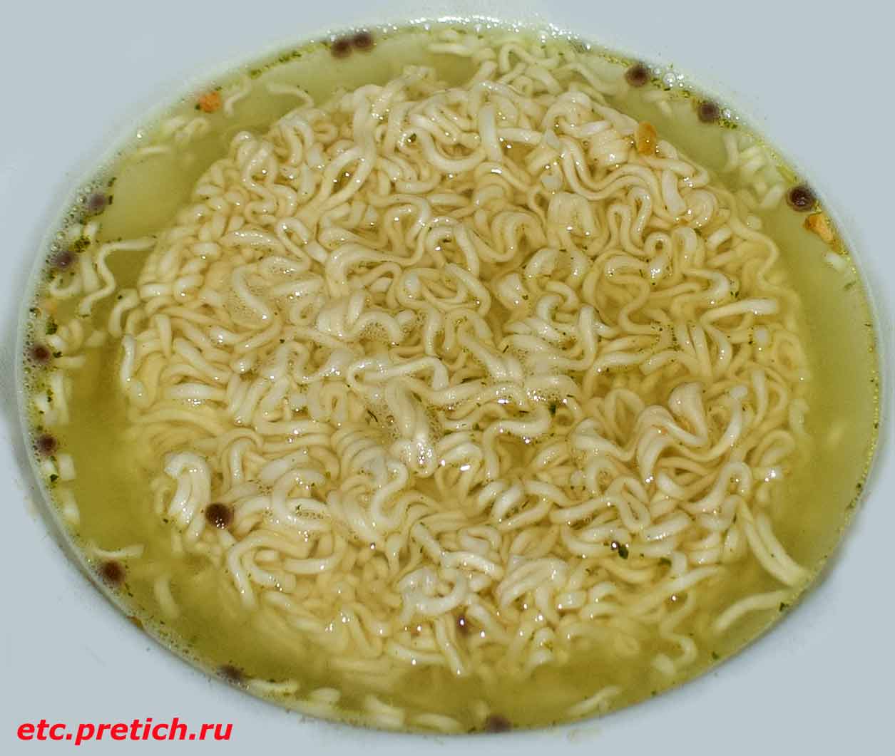 А мы прежде посмотрим, как выглядит этот бичпакет Hot Lunch в готовом виде. Лапша расправилась и разошлась, но не расползалась и не впитала в себя всю жидкость. Порошок растворился и окрасил кипяток в желтоватый оттенок, а сушеные овощи тоже размякли.