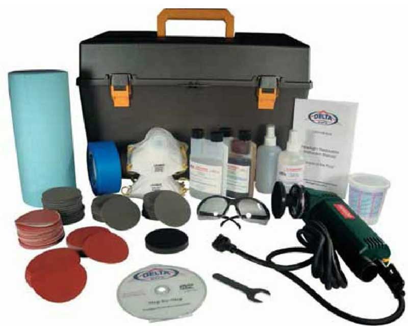Корпорация Delta Kits специализируется на ремонте автомобильного стекла и прозрачных пластиковых элементов. В ее арсенале имеется полный комплекс средств и материалов для полировки фар, которые можно приобрести как по-отдельности, так и в составе набора. Профессиональный комплект системы Delta Kits HLPRO302 с чемоданом и машинкой содержит все, что понадобится мастеру для восстановления помутневшей или выцветшей фары. Он позволяет восстановить оптическую прозрачность бесцветных линз. Delta Kits НЬРКО302включает в себя: подготовку, финишную жидкость и катализатор, 3-х дюймовый переходник, 2-х дюймовую голубая маскировочную ленту, респиратор, очки безопасности, рулон голубых полотенец, емкость для смешивания, накладки для шлифовального диска (320 ,600, 1500, 3000), шлифовальную машинку, пластиковую бутылку с распылителем, обучающий справочник-руководство, а также обучающий фильм по восстановлению фар.